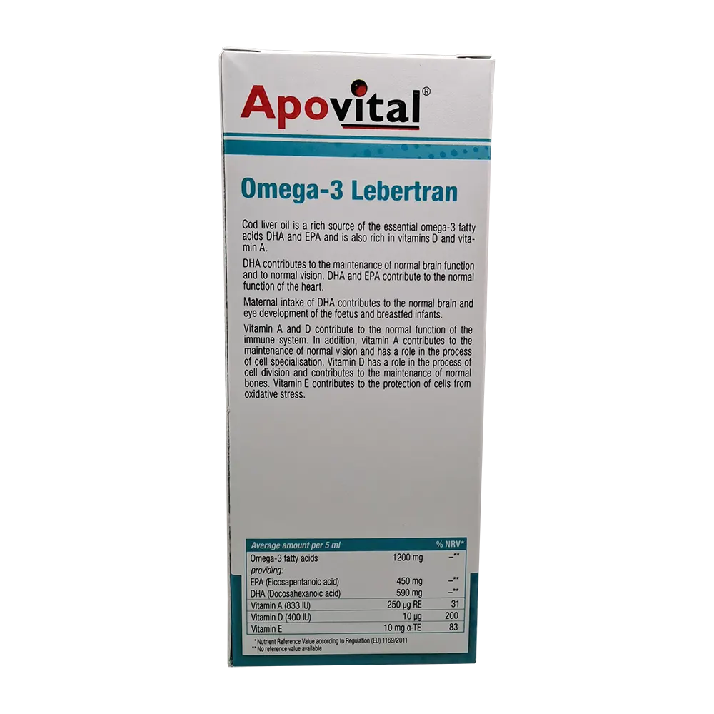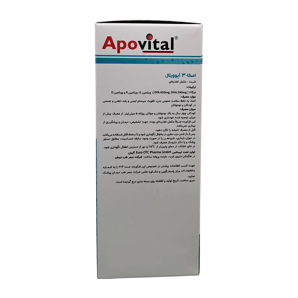 شربت امگا_3 آپوویتال یک مکمل غذایی ایده آل که منبع غنی از اسیدهای چرب امگا ۳ ضروری DHA و EPA بوده و همچنین سرشار از ویتامین D و A است. DHA به حفظ عملکرد طبیعی مغز و بینایی کمک میکند و هر دو به عملکرد طبیعی قلب کمک میکنند.