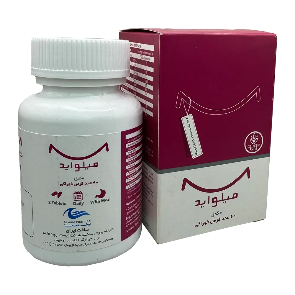 قرص میلو اید اروند فارمد با 11 ویتامین و ماده معدنی در کنار دو ترکیب مهم کوآنزیم Q10 و ال-کارنیتین فرموله شده و به عنوان یک مولتی ویتامین مینرال برای ارتقای سلامت عمومی بدن و تأمین نیازهای مغذی می باشد.