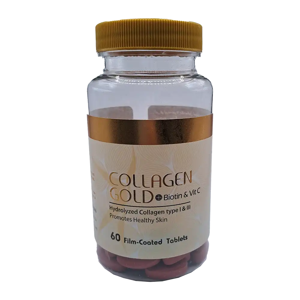قرص کلاژن گلد + بیوتین و ویتامین سی با دارا بودن 2500 میلی گرم کلاژن هیدرولیز شده به ازای هر 3 قرص در شادابی پوست،مو و ناخن ها موثر خواهد بود.