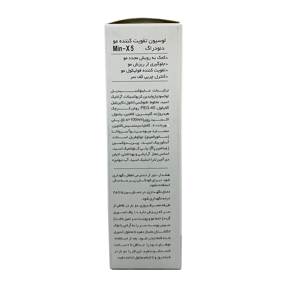لوسیون تقویت کننده مو دئودراگ مدل Min-X5 یکی از محصولات حرفهای در زمینه جلوگیری از ریزش مو و تحریک رشد مجدد مو است. این محصول با بهرهگیری از ماده مؤثر ماینوکسیدیل ۵ درصد و ترکیبات گیاهی مفید، به شکل تخصصی برای درمان ریزش موی آندروژنیک (الگوی مردانه و زنانه) فرموله شده است.