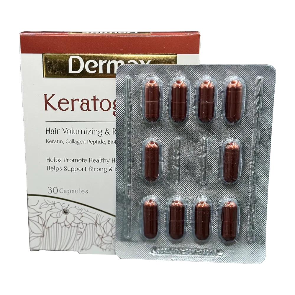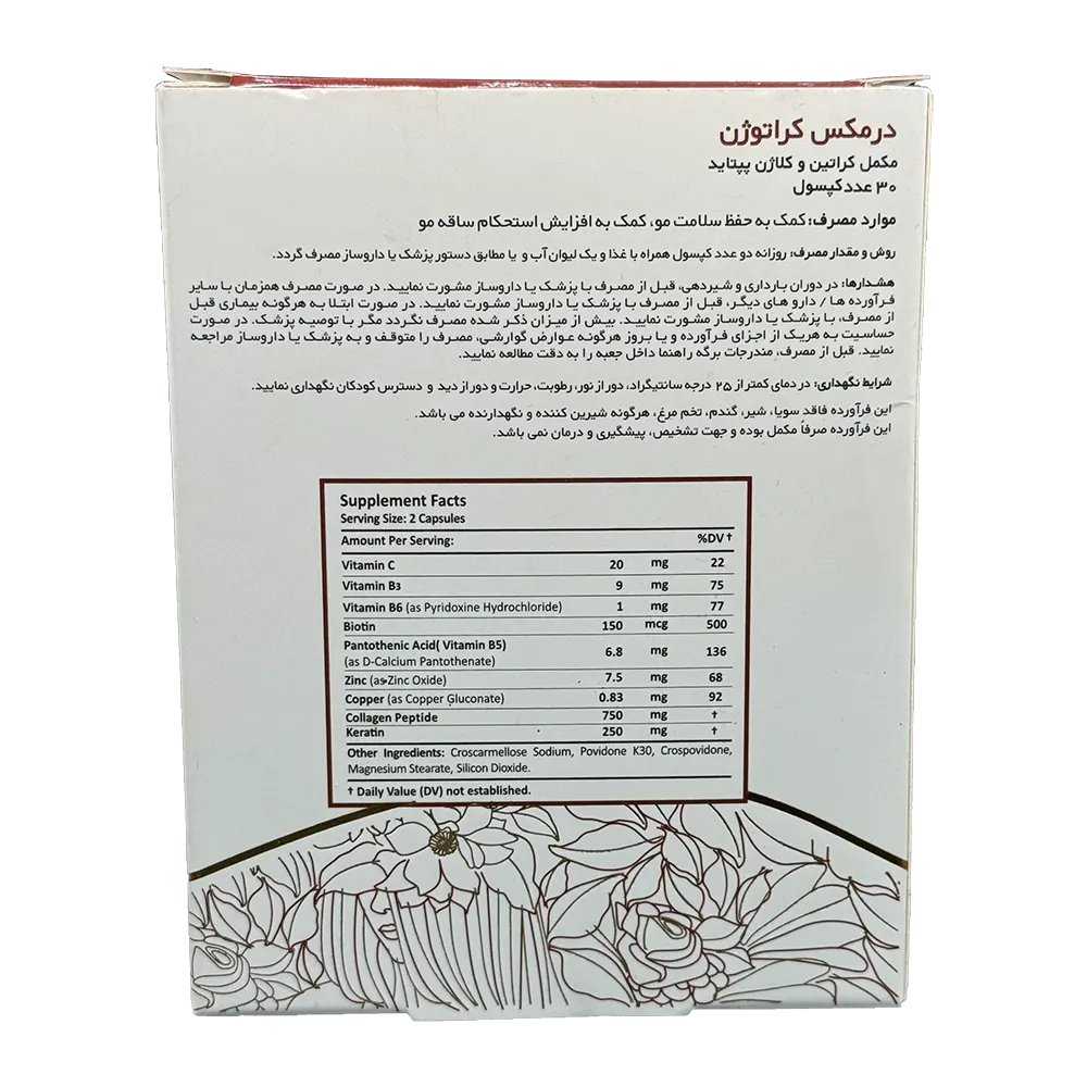 کپسول کراتوژن درمکس حاوی ترکیبی از ویتامینها، مواد معدنی و آمینواسیدهای ضروری جهت تقویت و رشد سالم مو، پوست و ناخنها بوده و به ویژه برای افرادی با ریزش مو و ناخنهای شکننده توصیه میشود.