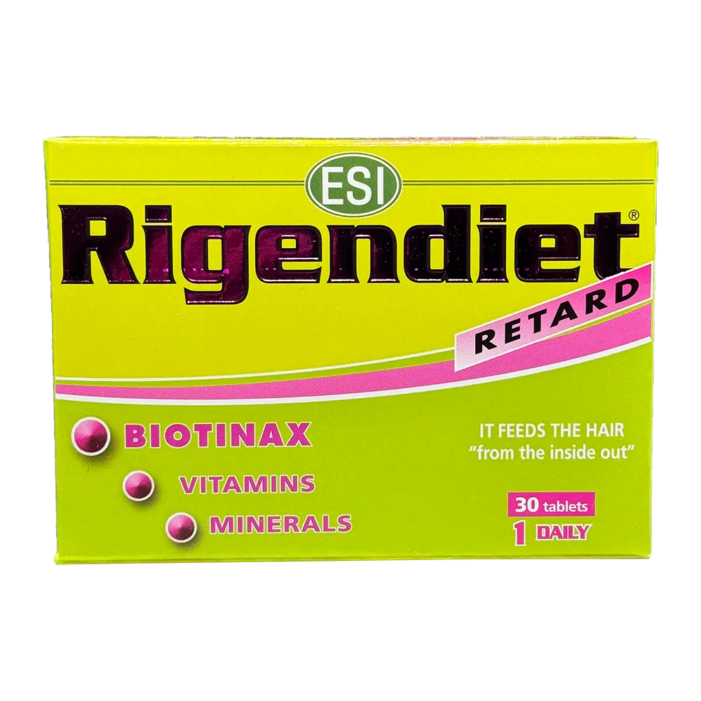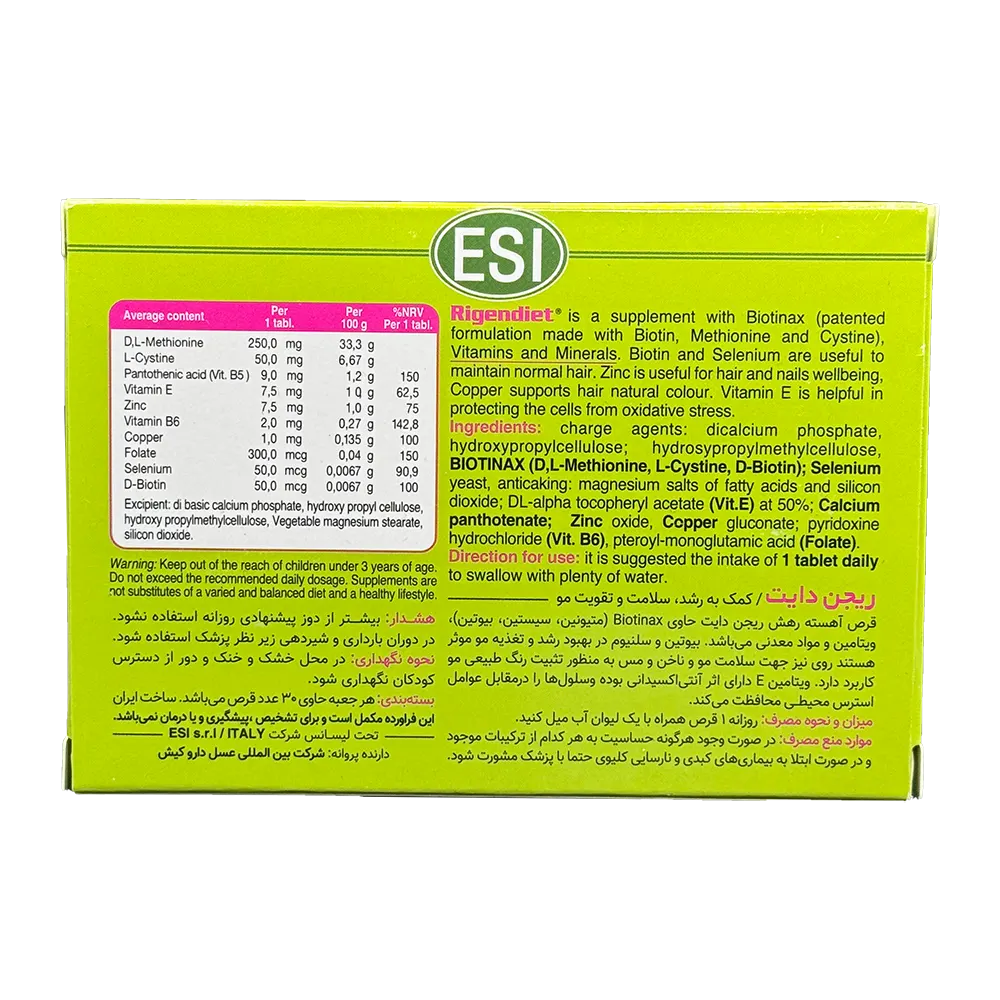 قرص Esi Rigendiet Tab یکی از محصولات منحصربهفرد برند معتبر ESI – ایتالیا است که با فرمول تخصصی Biotinax® (شامل بیوتین، متیونین و سیستئین)، ویتامینها و مواد معدنی مانند زینک، مس، سلنیوم، ویتامین E و B6، جهت تقویت رشد مو، جلوگیری از ریزش و حفظ سلامت ناخنها طراحی شده است.