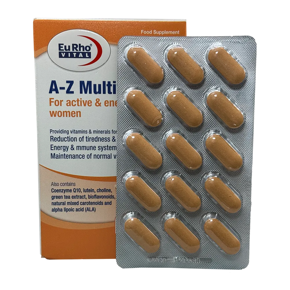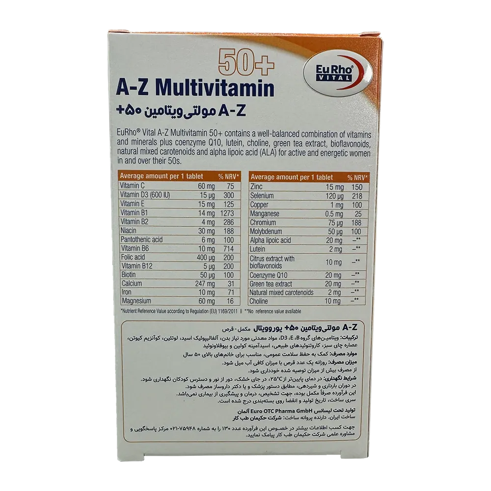 قرص A-Z مولتی ویتامین بانوان بالای ۵۰ سال یوروویتال حاوی ترکیبی کامل از ویتامین‌ها، مواد معدنی و آنتی‌اکسیدان‌هاست که نیازهای تغذیه‌ای زنان در سنین بالاتر را پوشش می‌دهد.