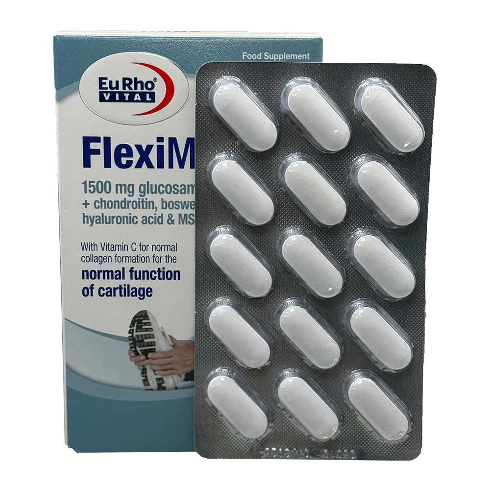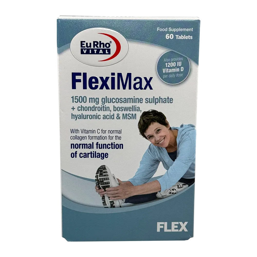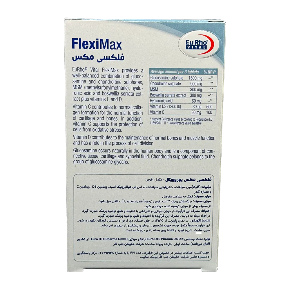قرص فلکسی مکس یوروویتال (Eurho vital Flexi Max Tab) یک مکمل شیمیایی و ترکیبی با فرمولاسیون علمی است که توسط برند معتبر اروپایی Eurho Vital تولید و عرضه میشود. این مکمل طراحی شده تا از کاهش درد مفصل، تحلیل غضروف و تورم مفاصل در شرایطی همچون آرتروز، آسیبهای ورزشی و افزایش سن جلوگیری کند.