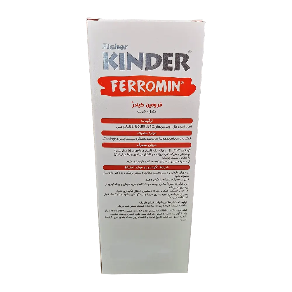 شربت فرومین فیشر کیندر حاوی آهن،چهار نوع ویتامین و املاح ضروری (مس) برای کودکان و نوجوانان است.