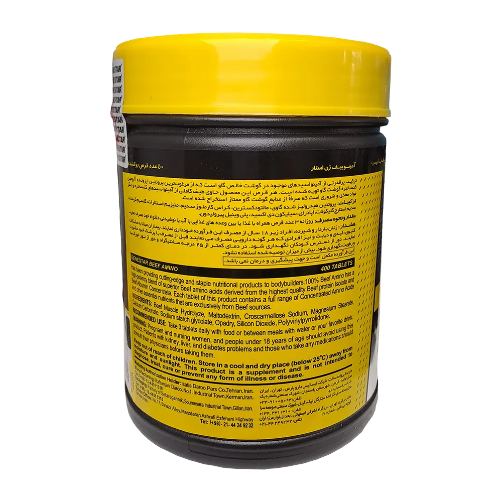 قرص آمینو بیف ژن استار ترکیب پر قدرتی از آمینواسیدهای موجود در گوشت خالص گاو است که از مرغوب‌ترین پروتئین ایزوله و آلبومین کنسانتره گوشت گاو تهیه شده است.