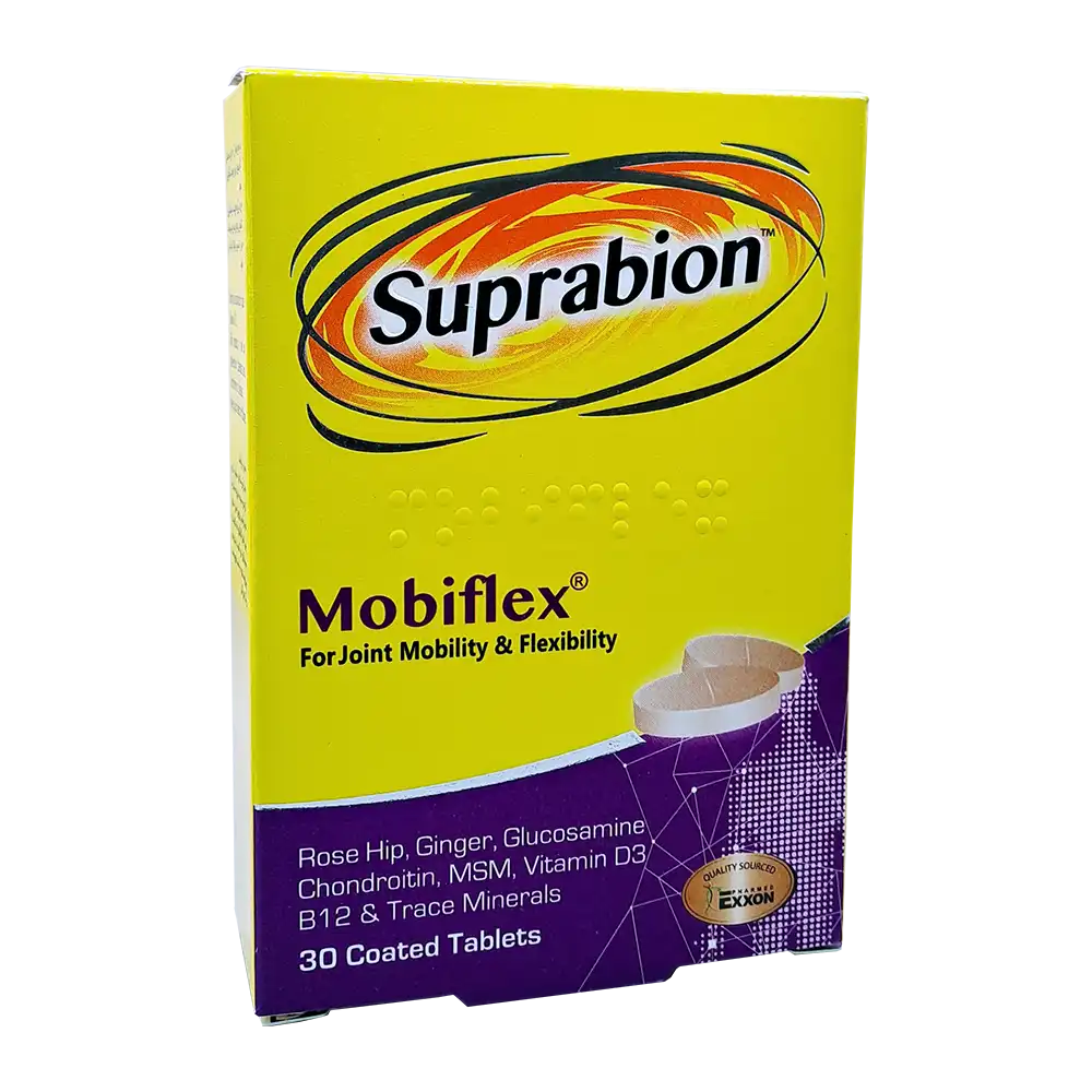قرص موبیفلکس سوپرابیون ترکیبی کامل برای بهبود عملکرد مفاصل،پیشگیری و درمان آسیبهای مفصلی،کمک به ترمیم غضروفها،بهبود حرکت و افزایش انعطافپذیری مفاصل میباشد.