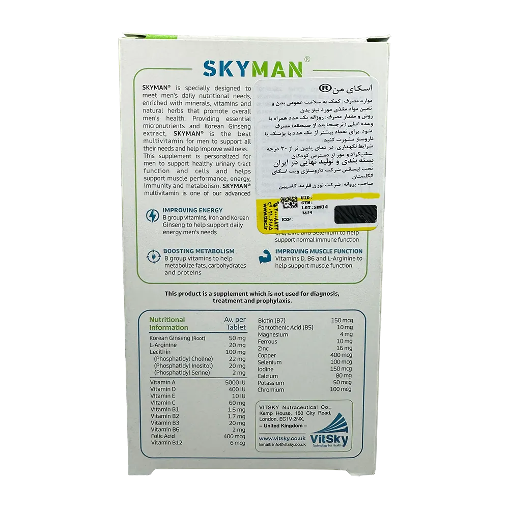 قرص اسکای من ویت اسکای مکمل مولتی ویتامین مخصوص آقایان است.این محصول حاوی ویتامین‎‌ها،مواد معدنی به همراه گیاه جینسینگ کره‌ای،اسیدآمینه ال آرژنین،لسیتین است.