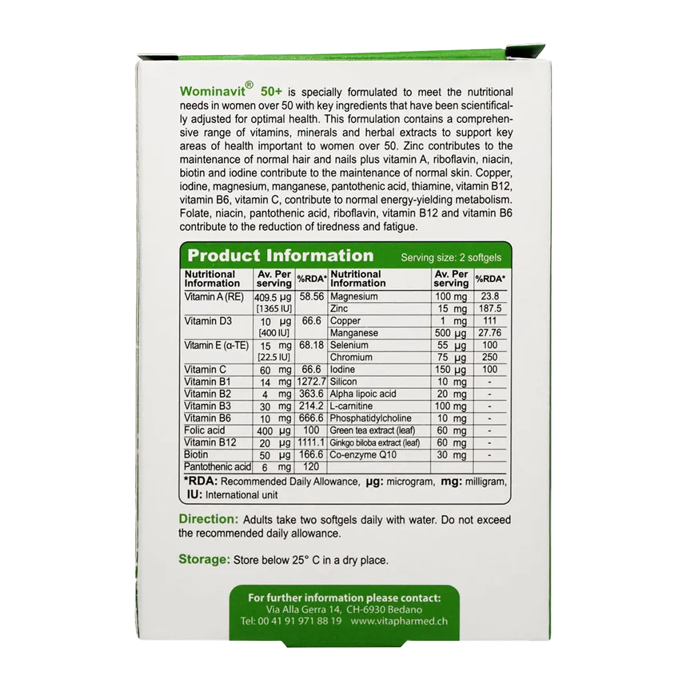 Viva Tune Wominavit +50 Softgels شامل ترکیبی از ویتامینها،مواد معدنی،آنتیاکسیدانها و عصارههای گیاهی است که به عنوان یک راهکار ساده و موثر برای بهبود سلامتی و کاهش علائم پیری در زنان میانسال مورد استفاده قرار میگیرد.